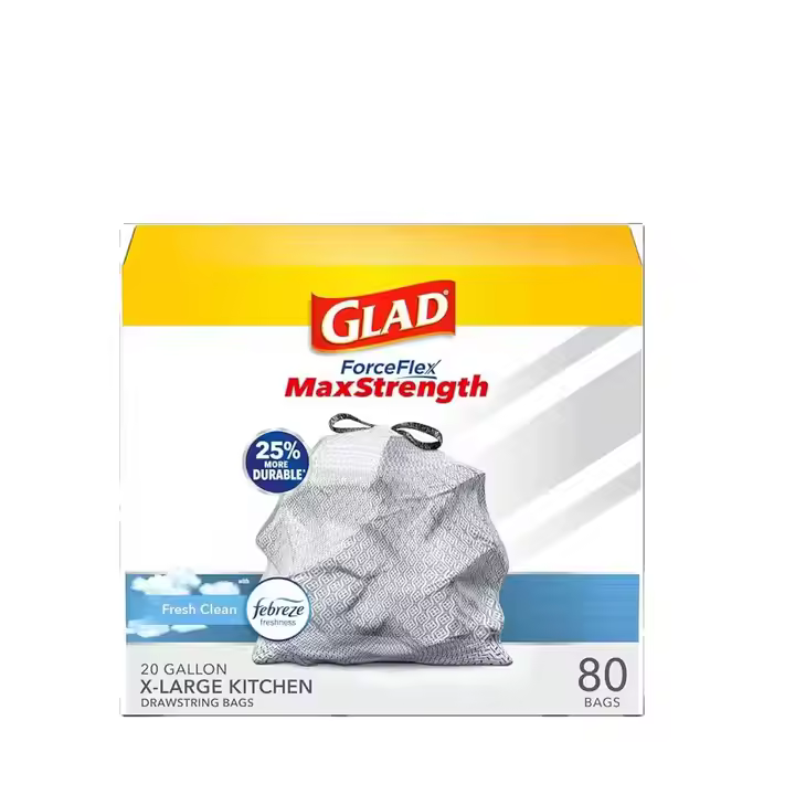 25% MORE DURABLE*: Glad ForceFlex MaxStrength X-Large Kitchen Trash Bags are 25% more durable versus Glad 20 gallon ForceFlex X-Large kitchen bags; packaging may vary FORCEFLEX MAXSTRENGTH: These bags feature double side seams, a reinforced bottom and grips the can drawstring plus Leak and rip protection against leaks, rips and tears NEUTRALIZES TOUGH TRASH ODORS: Febreze freshness in a subtle Fresh Clean scent works to trap odors and helps eliminate garbage smells in the kitchen PRODUCTS WITH LESS PLASTIC: Glad ForceFlex MaxStrength X-Large Kitchen Trash Bags are made with less plastic than the competition** without sacrificing strength DOING MORE TO WASTE LESS: If everyone in the US chose Glad drawstring trash bags it would save 100 million pounds of plastic from going into landfills every year**